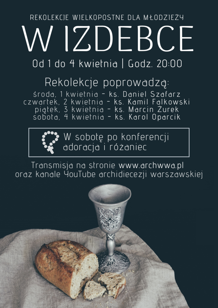 Rekolekcje dla młodzieży poprowadzą: ks. Daniel Szafarz, ks. Kamil Falkowski, ks. Marcin Żurek i ks. Karol Oparcik. Codziennie o godz. 20:00 jeden z księży wygłosi krótką katechezę, natomiast w sobotę – na zakończenie rekolekcji – młodzi zostaną zaproszeni do wspólnej modlitwy online, którą poprowadzi ks. Marcin Wiśniewski.
