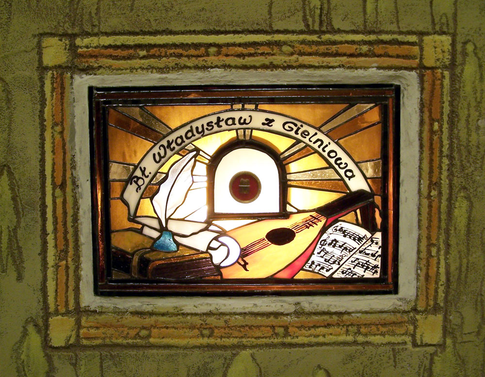 Lewe skrzydło tryptyku poświęcone jest bł. Władysławowi z Gielniowa. Znajdujący się w nim obraz jest kopią obrazu z kościoła o. bernardynów w Krakowie. Tło stanowi kolaż widoku parafialnego kościoła i kościoła św. Anny z fragmentem Placu Zamkowego.