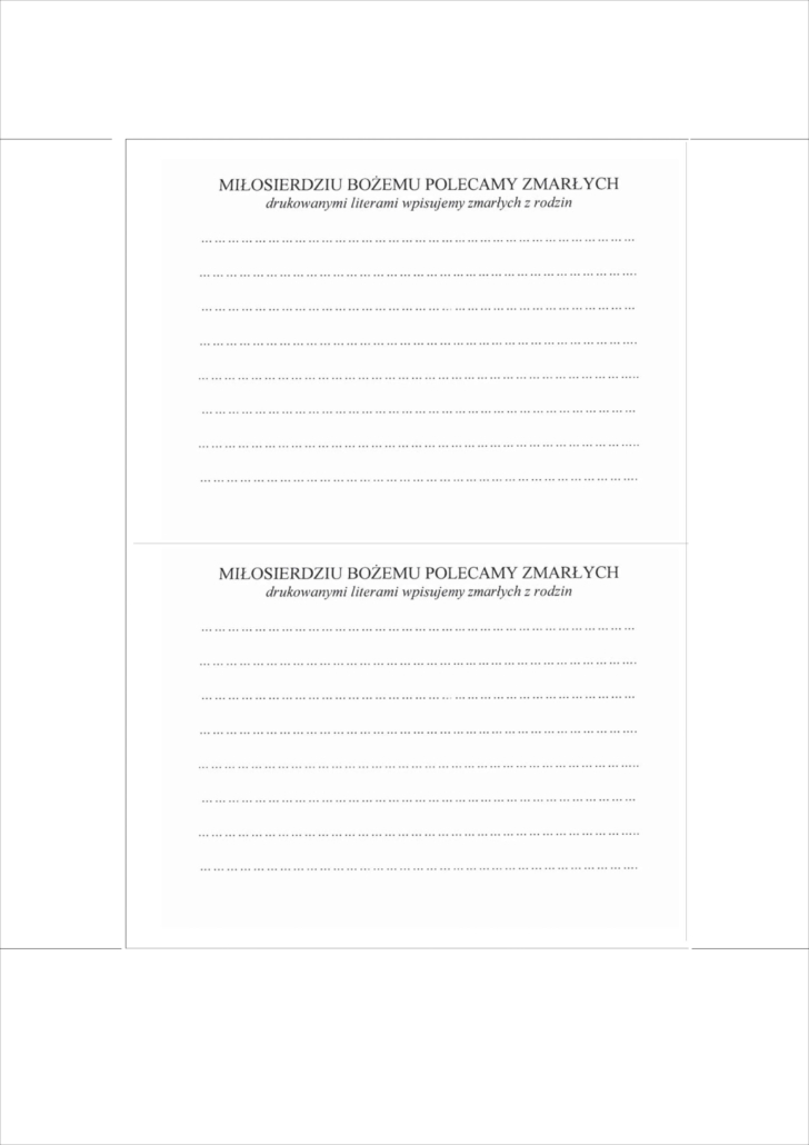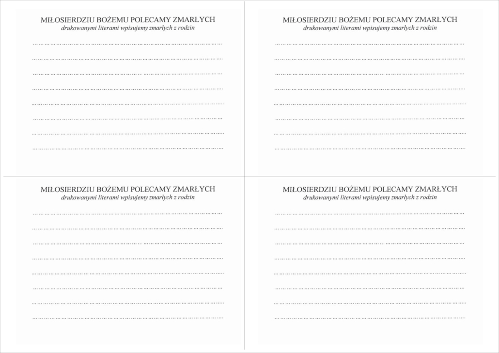 Kartki, na których należy napisać imiona i nazwiska zmarłych, są do pobrania z półki obok kiosku parafialnego. Prosimy o pisanie drukowanymi literami, aby uniknąć błędów. Wypominki przyjmujemy w kancelarii lub zakrystii.