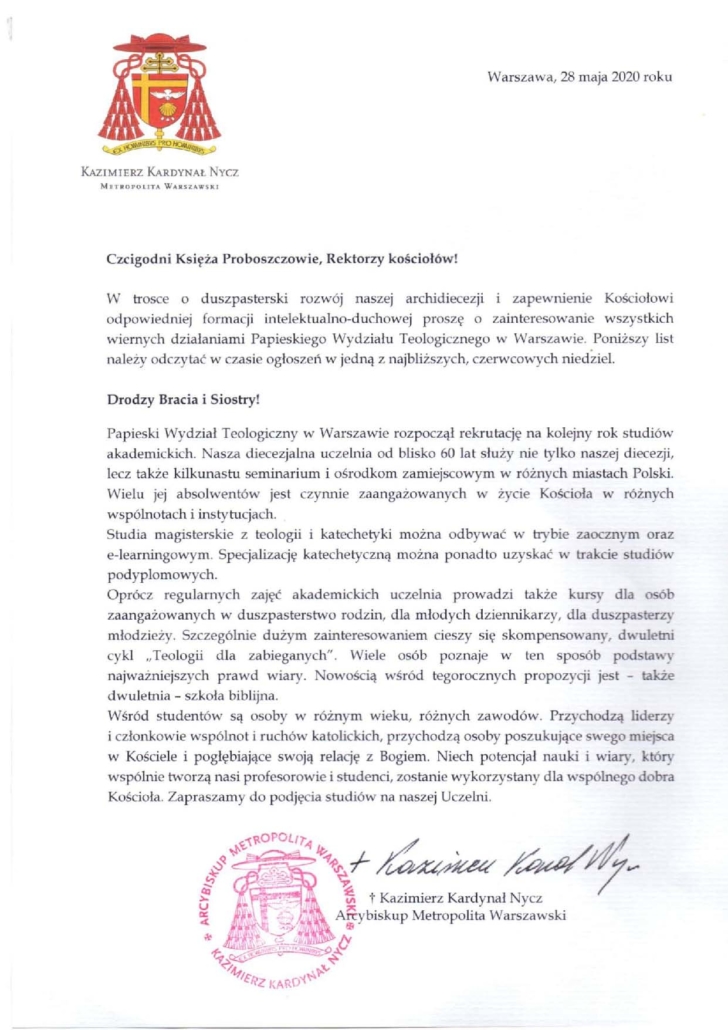 List Kardynała Kazimierza Nycza w sprawie rekrutacji na studia w Papieskim Wydziale Teologicznym w Warszawie